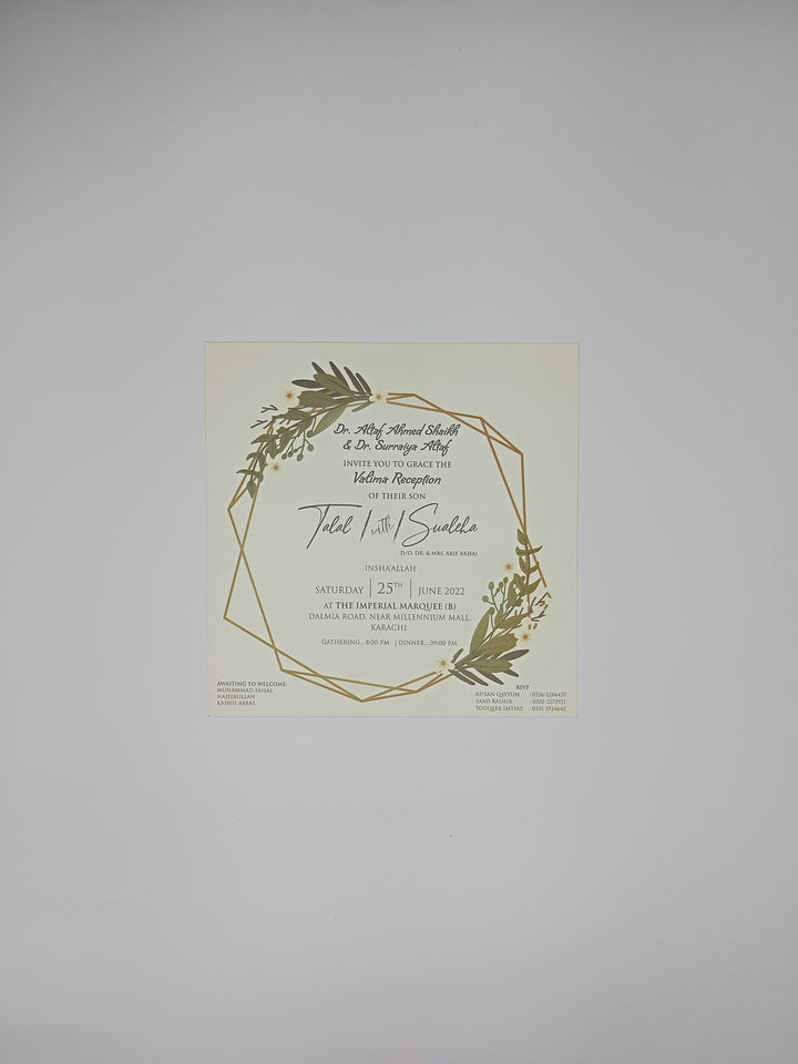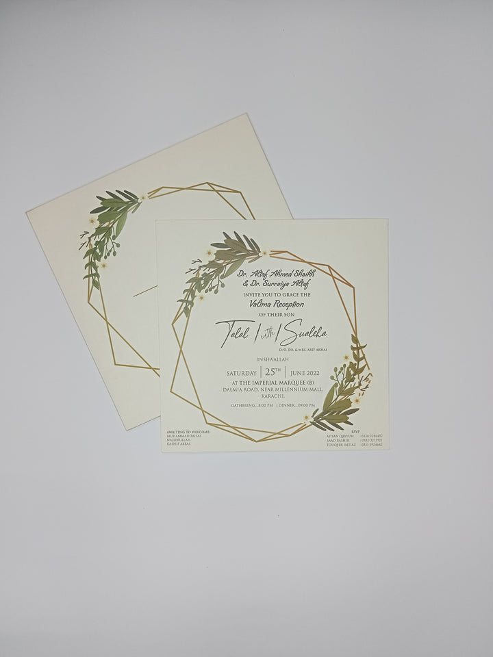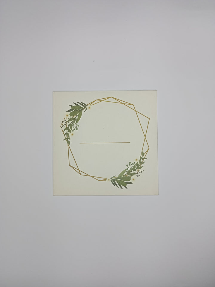 A Blossoming Union: An elegant invitation featuring a delicate gold geometric frame adorned with lush botanical elements, perfectly capturing the beauty of a new beginning.