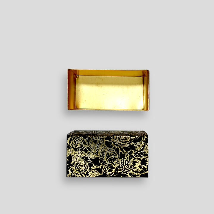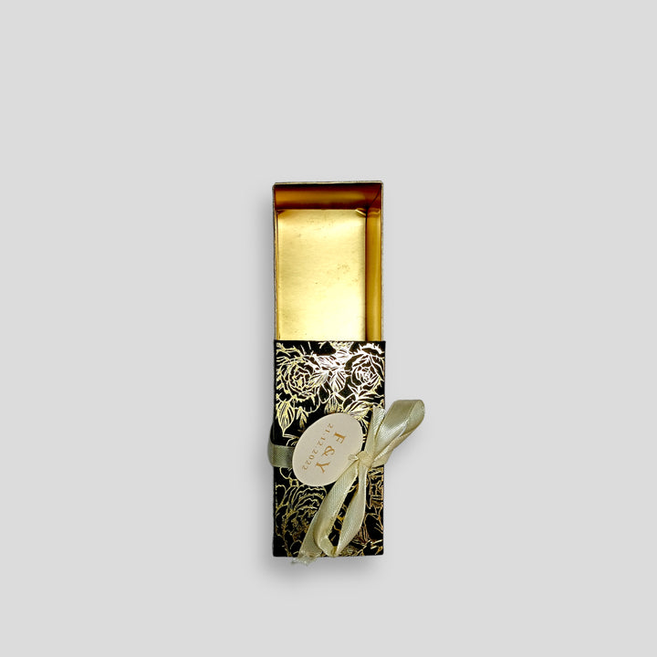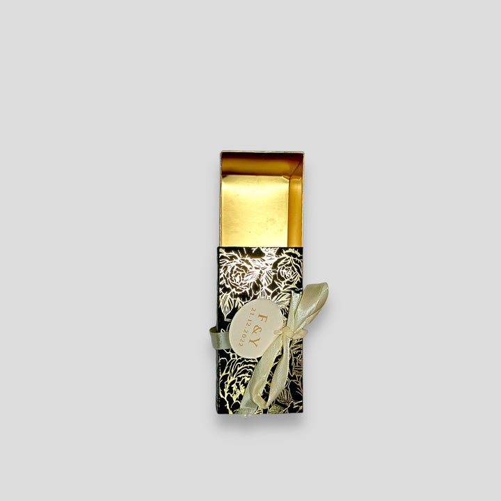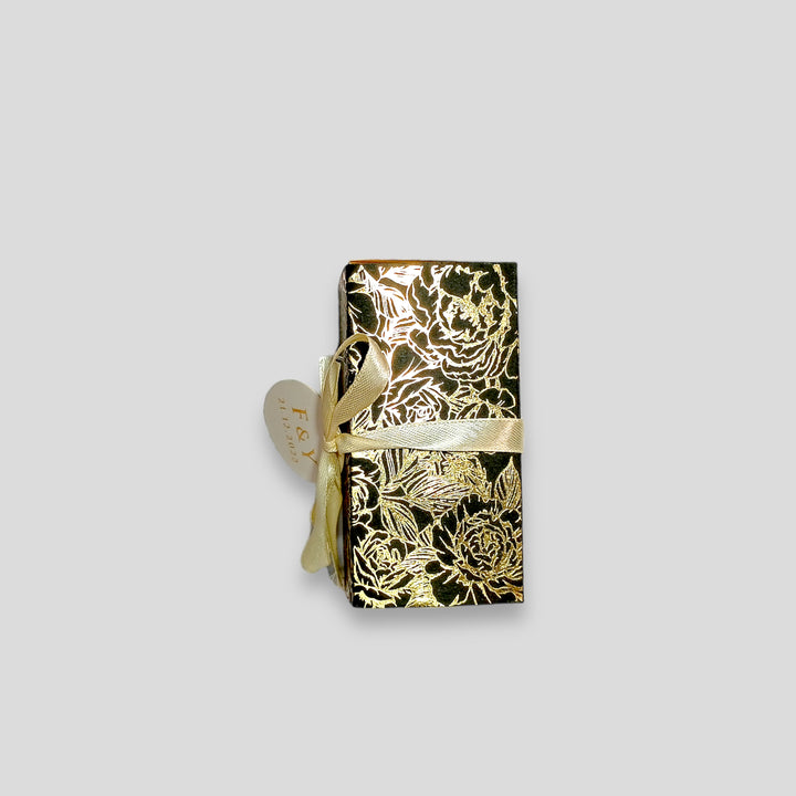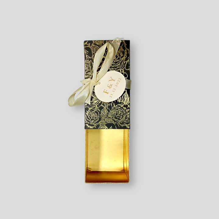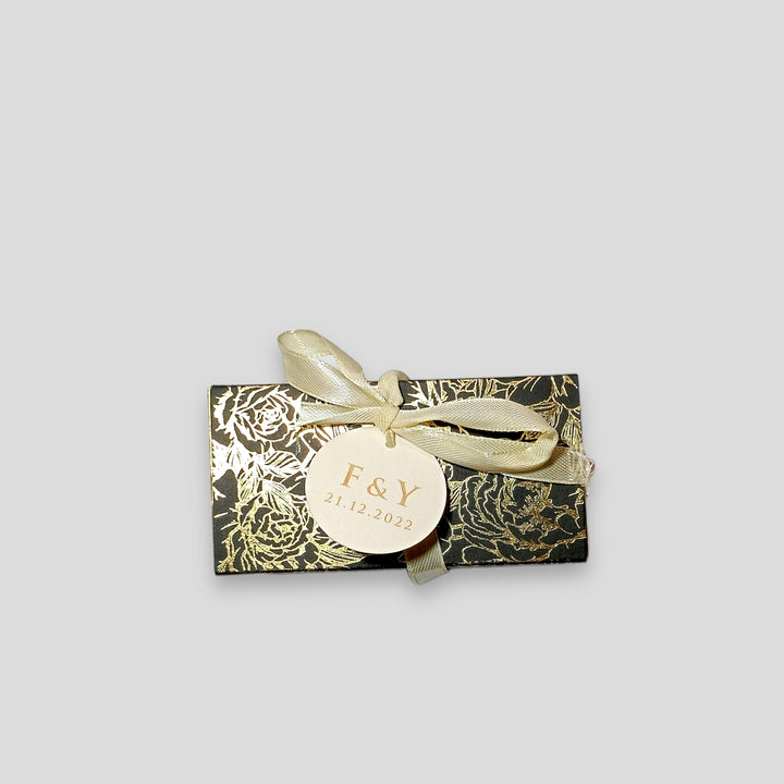 "A luxurious black favour box, exquisitely adorned with a shimmering gold rose pattern, elegantly secured with a matching golden ribbon, and finished with a personalized tag, embodying a perfect blend of romance and opulence."