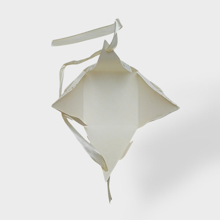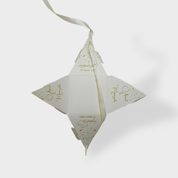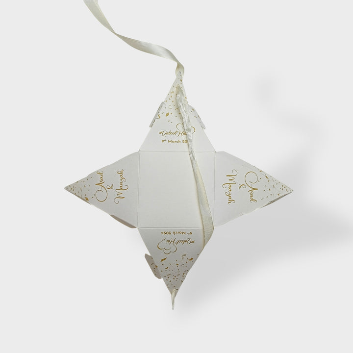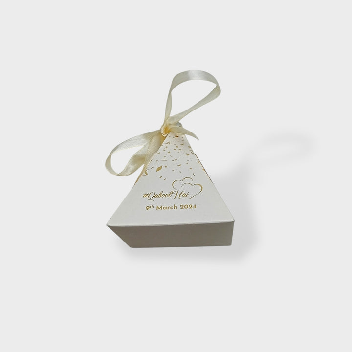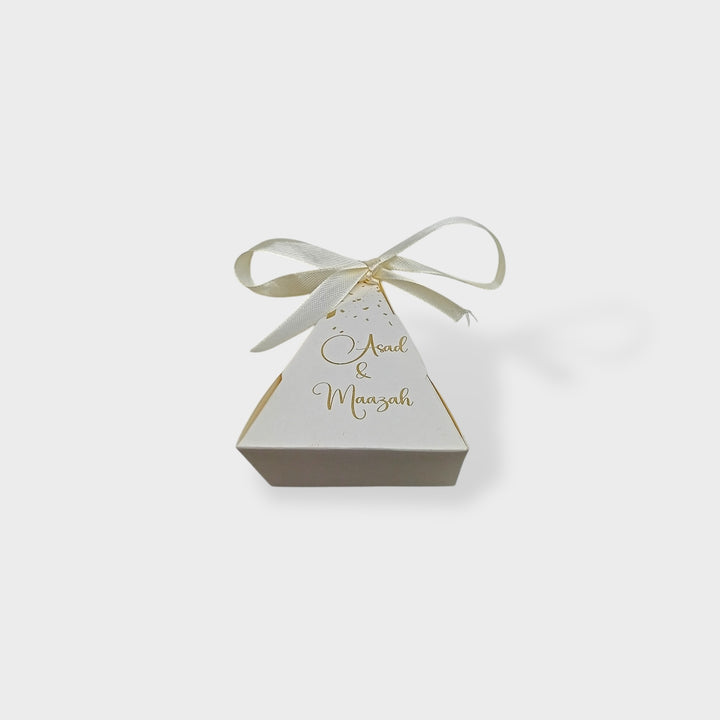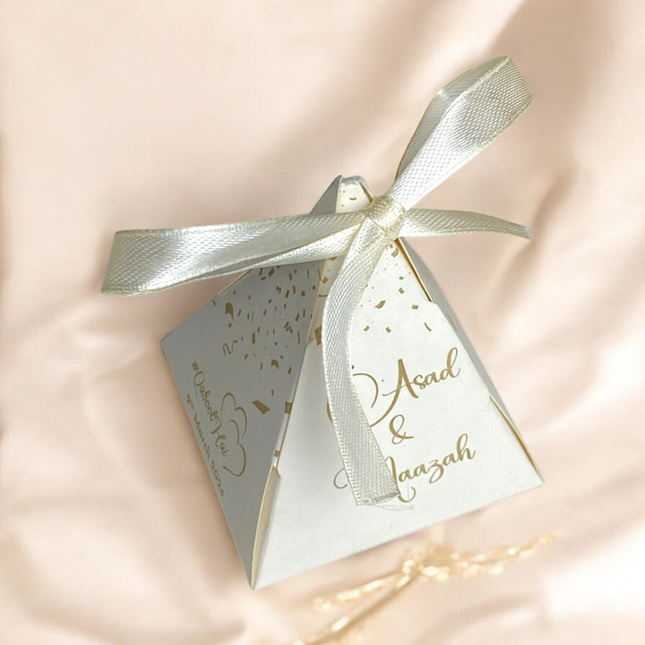 “Golden Bloom Box is a symbol of elegance and festivity, designed in a chic pyramid shape with delicate gold detailing and a satin ribbon bow. Its graceful charm makes it the perfect keepsake for weddings and celebrations, holding sweet treats or tokens of love in the most beautiful way.”