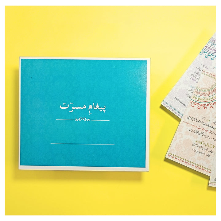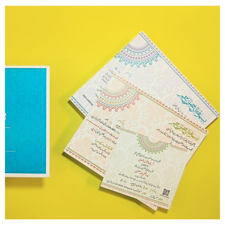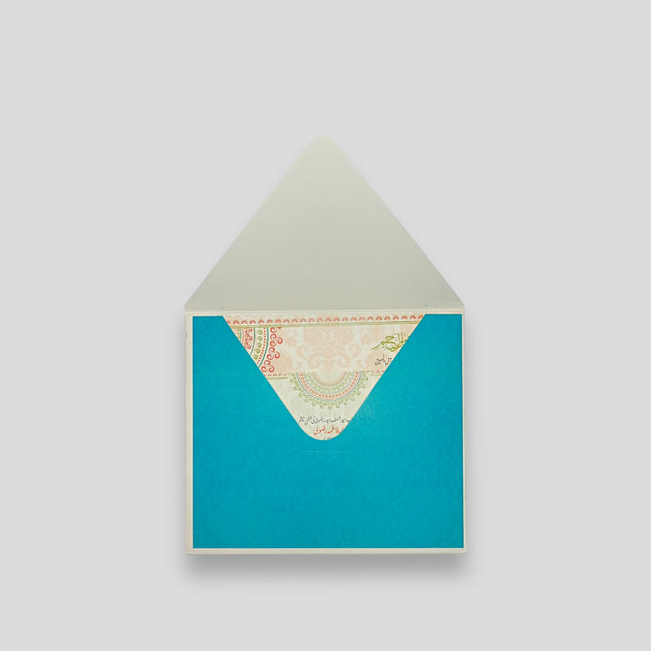 "This invitation perfectly captures 'Glad Tidings & Grandeur' with its elegant blue cover bearing the 'Message of Joy,' opening to reveal a vibrant and traditional ensemble of cards, promising a celebration filled with happiness and splendor."