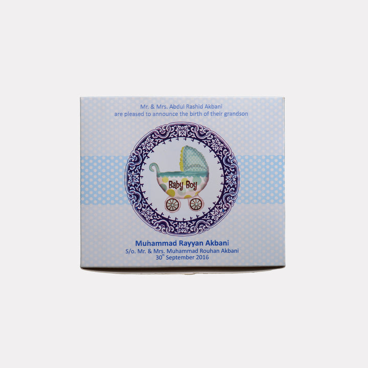 "The Good News Dispatch: Adorned in gentle blues and playful patterns, this special delivery carries the heartwarming announcement of your little one's arrival."