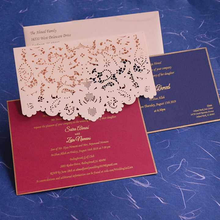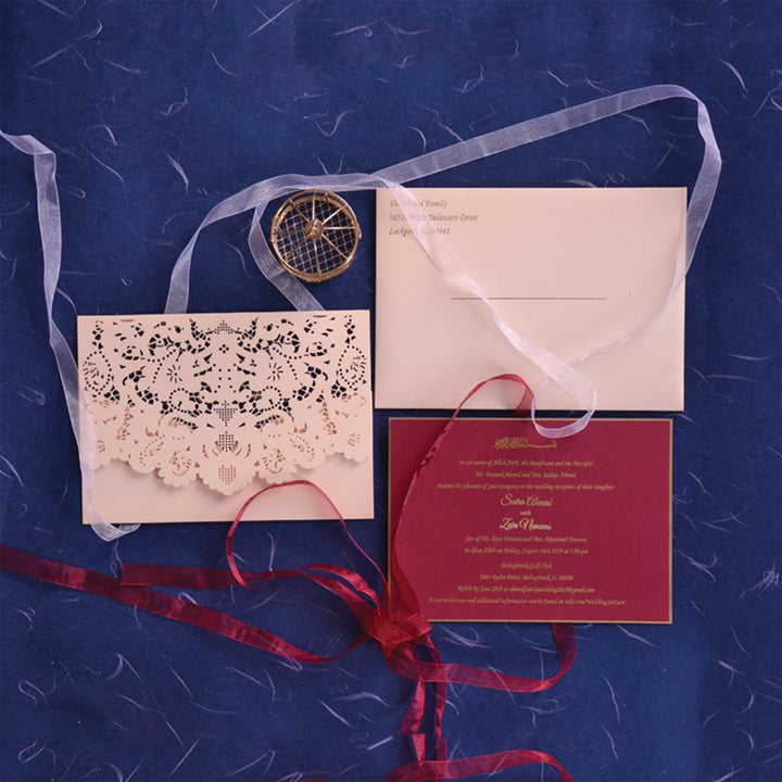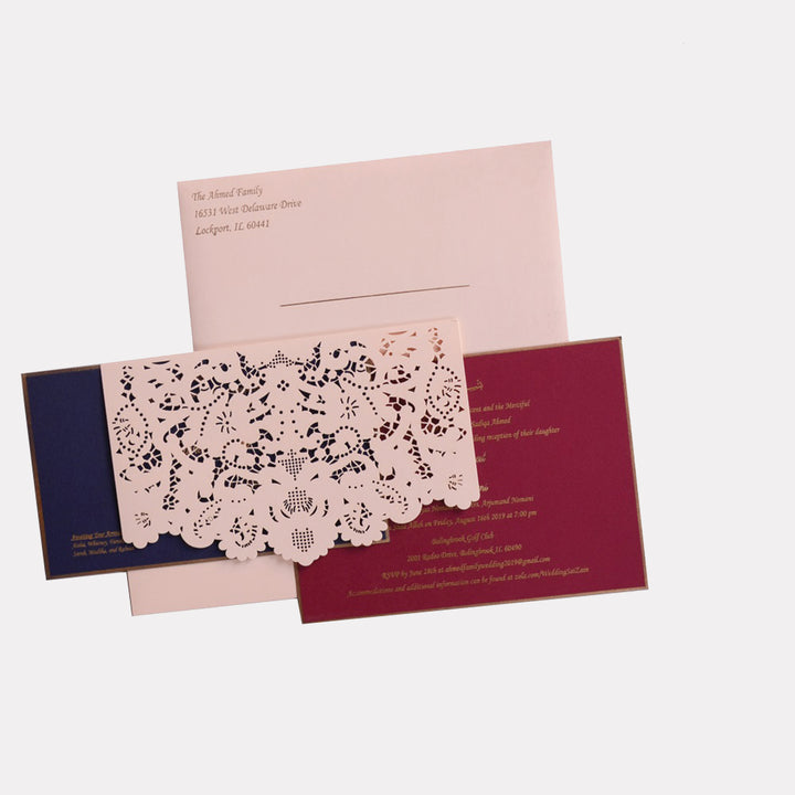 Delicately adorned with intricate lace-cut elegance and wrapped in rich hues of maroon and navy, A Love So Fine captures the essence of timeless romance. Gold accents and graceful textures come together in a design that celebrates love in its most refined form — classic, heartfelt, and forever cherished.