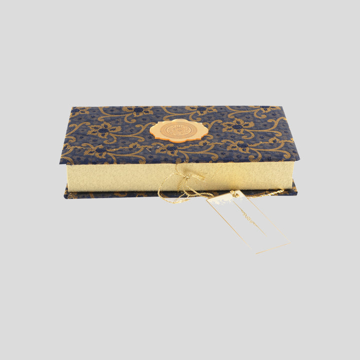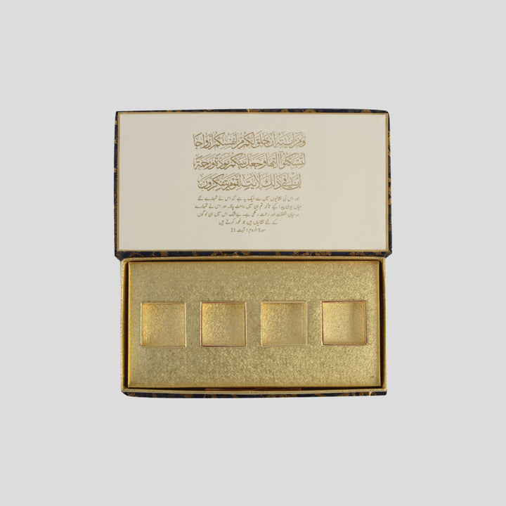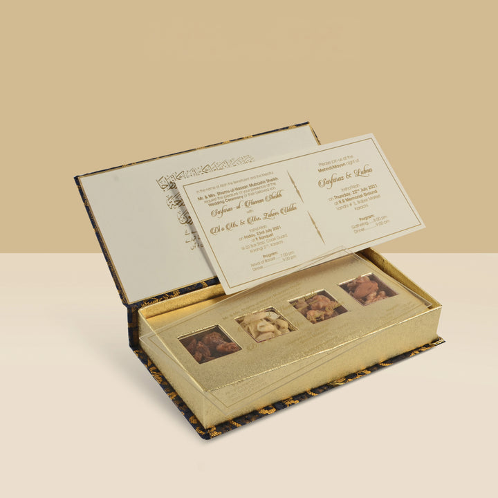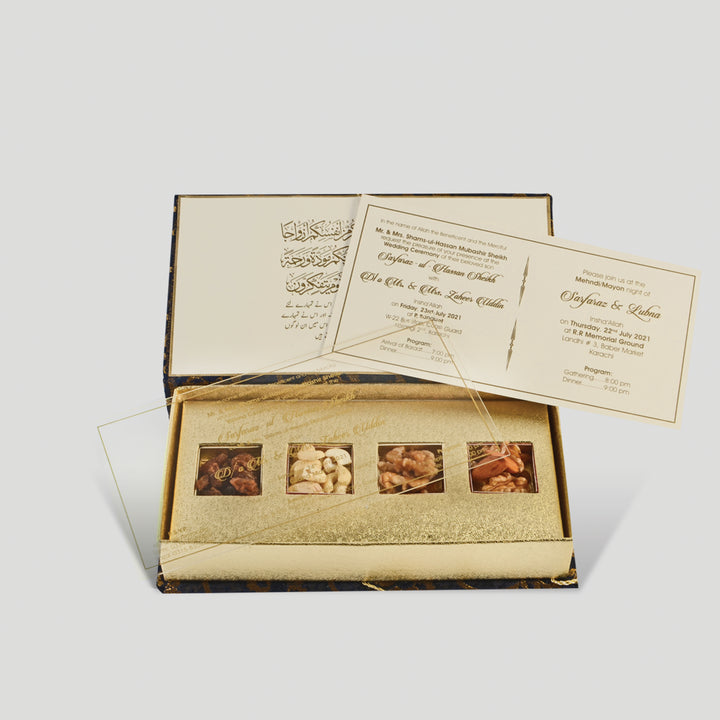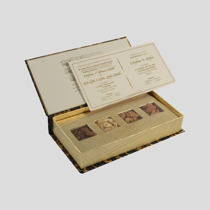"'The Sweet Beginnings Box' is an exquisite golden-hued invitation, elegantly opening to reveal your special day's details alongside delightful dry fruit compartments – a true prelude to a joyous celebration."