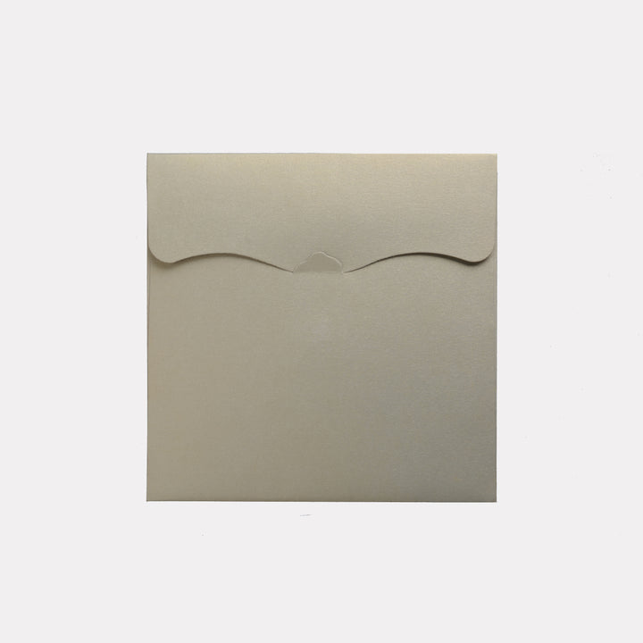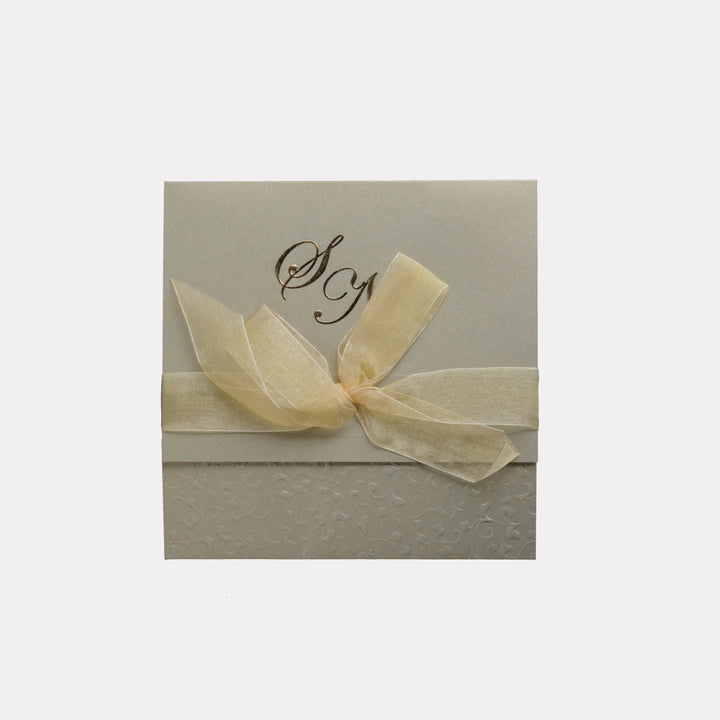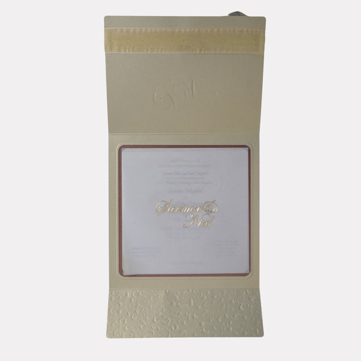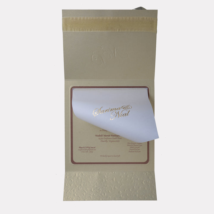 "'Golden Fold & Flourish' unveils your special announcement with a sophisticated upward fold, revealing intricate golden accents and a charming monogram, setting a tone of refined elegance."