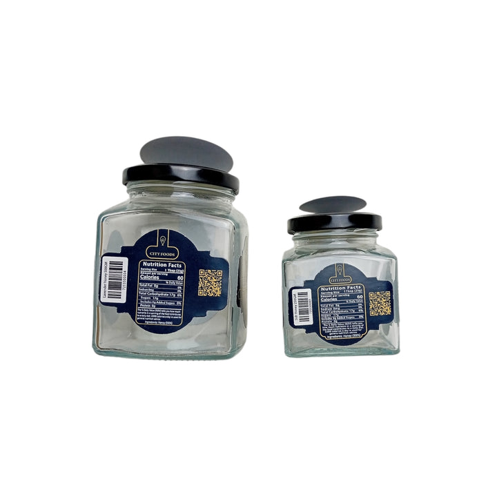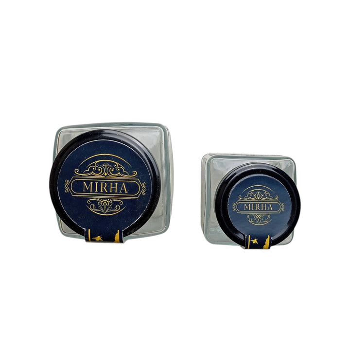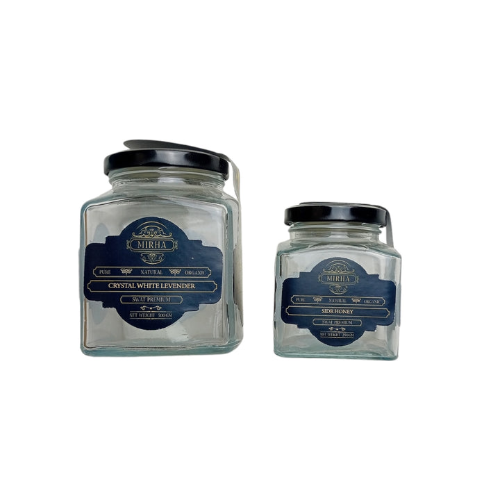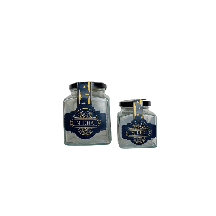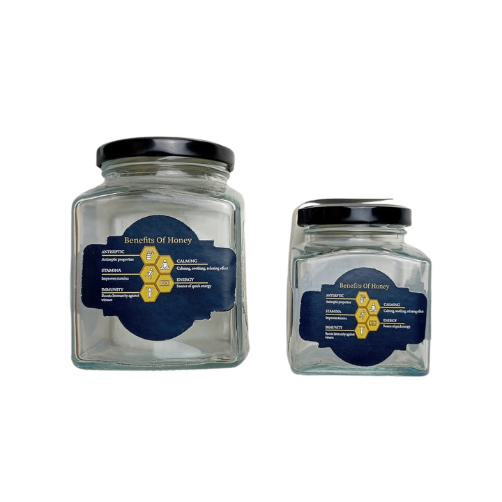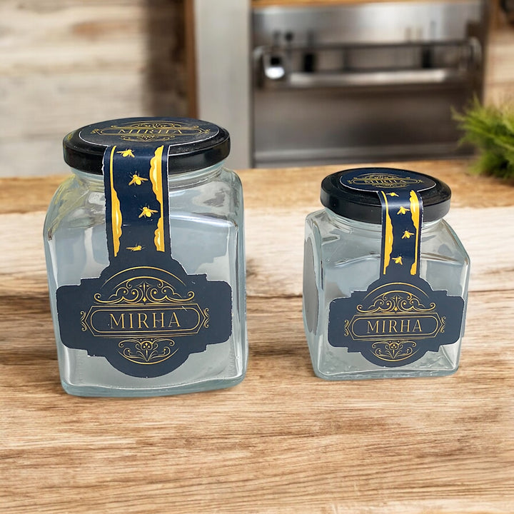 The Sweet Harvest jar is a nod to timeless elegance. Its distinctive square shape and clear glass provide a modern, clean look, while the vintage-inspired label grounds it in tradition. The ornate gold detailing and classic typography create a sense of heritage and luxury, making the jar a beautiful object in its own right—a perfect blend of contemporary form and classic charm.