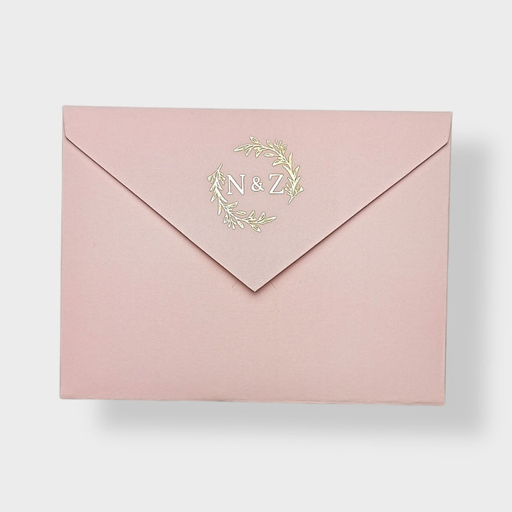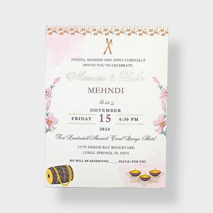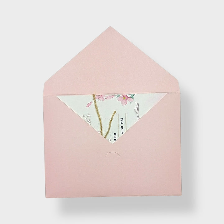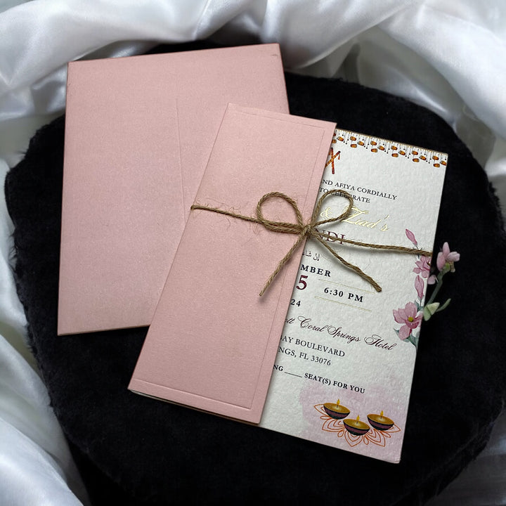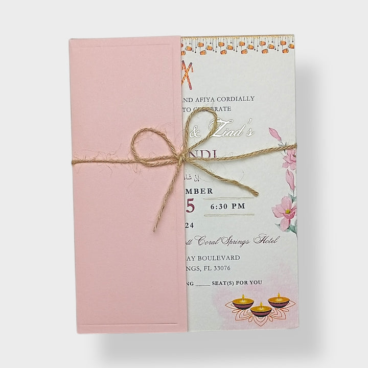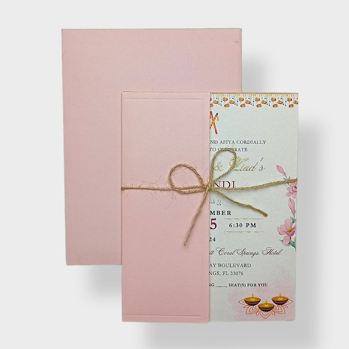 This invitation set blends romantic color with rustic charm. The main card, featuring the wedding and Mehndi details, is wrapped in a smooth, blush pink jacket and secured with a rustic jute twine tie, symbolizing the union. The inner design contrasts traditional diya (lamps) and mehndi-inspired accents with elegant gold foil text. The overall aesthetic is warm, inviting, and effortlessly chic, combining traditional festivity with contemporary soft color and texture.