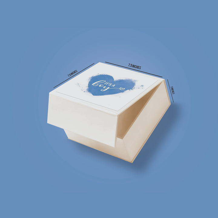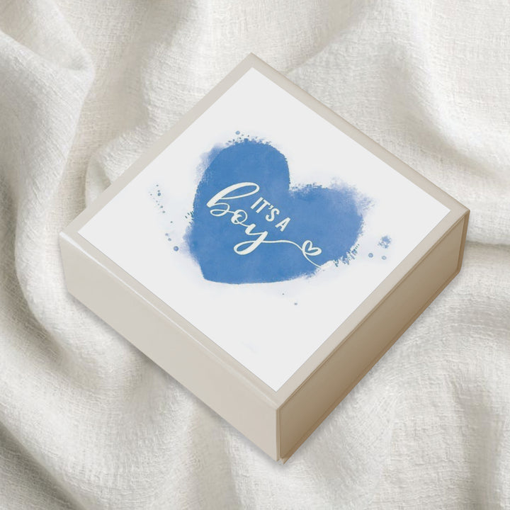 "Share the heartfelt news of your son's arrival with The Boy's Heart Box. This charming keepsake, featuring a striking blue watercolor heart, is a truly artistic and loving way to proclaim 'It's a Boy!'"