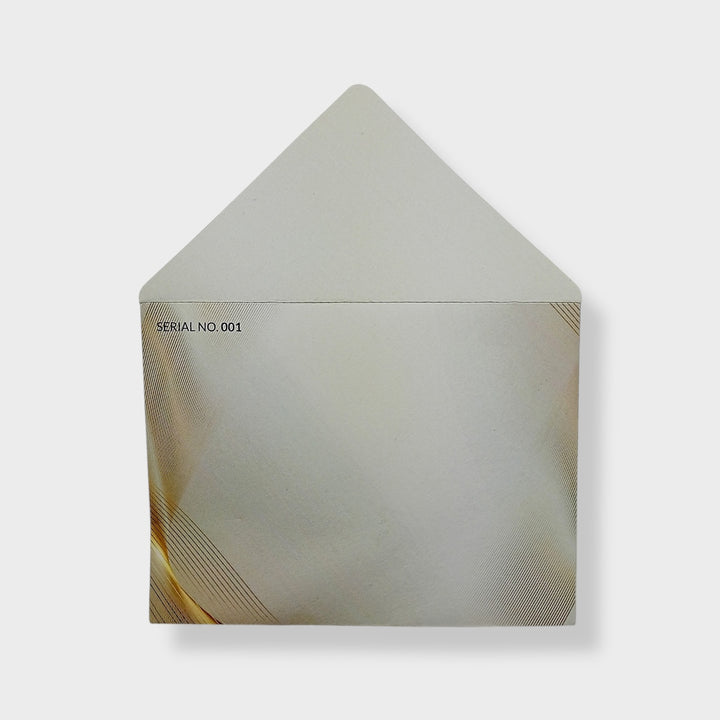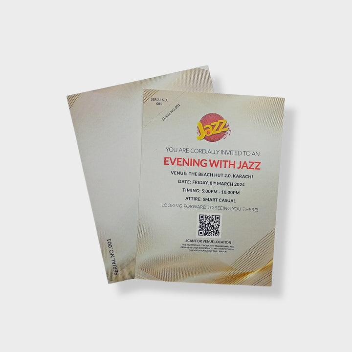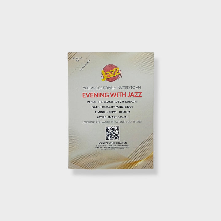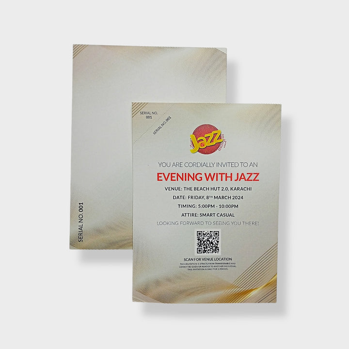 The "Evening with Jazz" invitation is a masterpiece of modern elegance. The card's design features a series of delicate, golden geometric lines that create a subtle yet dynamic pattern, giving the entire piece a sophisticated feel. This intricate pattern provides a stunning backdrop for the bold, stylized "Jazz" logo, which serves as a powerful focal point. The choice of a soft, matte paper enhances the luxurious look, making this card a tangible preview of a high-end, exclusive event.