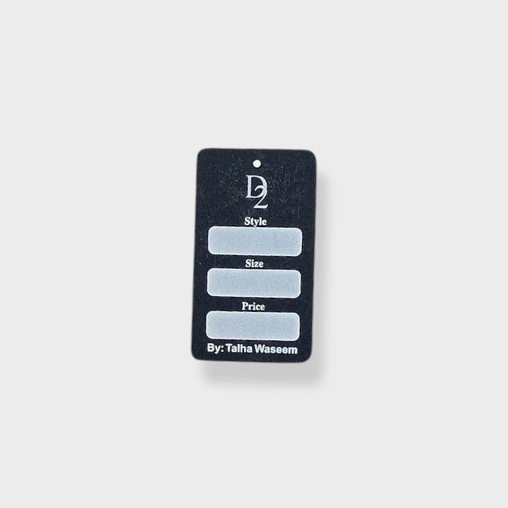 It is crafted from a rich, deep black matte cardstock, creating a sophisticated background. The design features a bold, embossed gold foil finish for all text and graphics, which includes an ornate laurel wreath encircling a striking dual-letter monogram ('D2'). The tag further features the brand's signature, "by Talha Waseem," set between gold foil lines, making it a powerful statement of elegance and exclusivity.