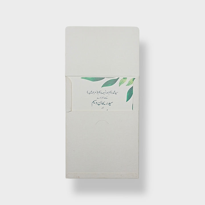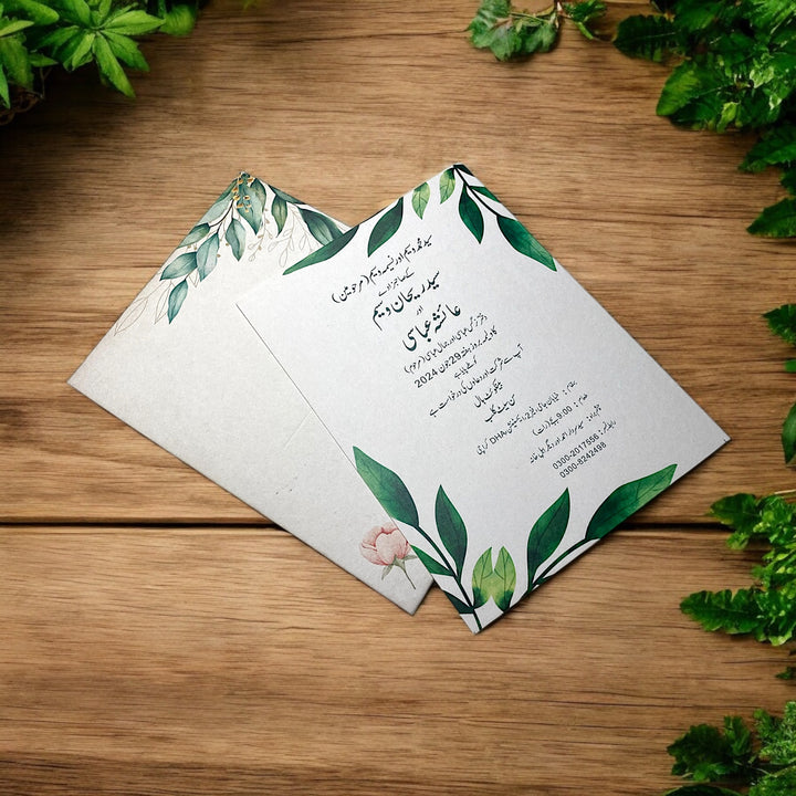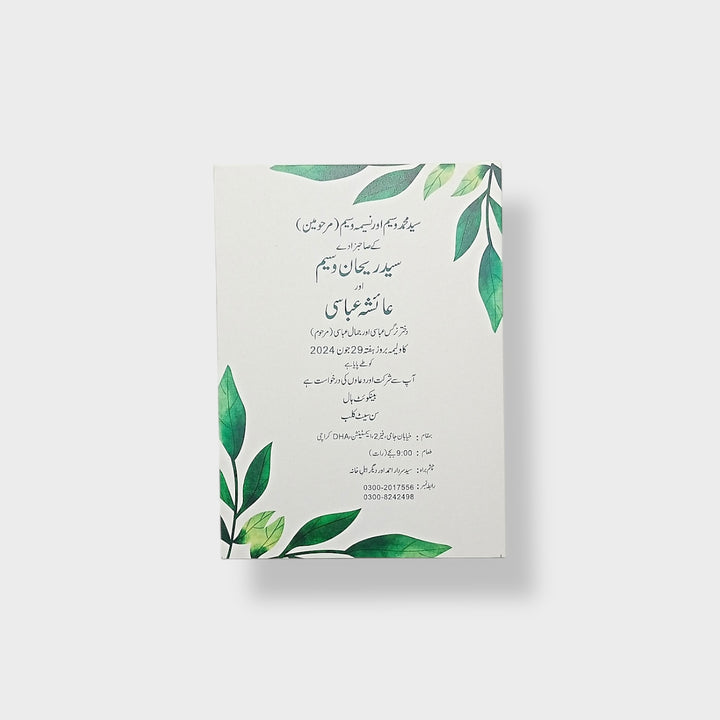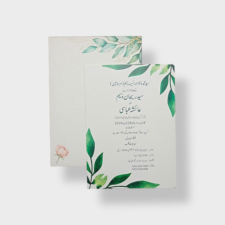 “Verdant Grace” is an 8 x 5.5 inch invitation card adorned with lush green foliage and subtle floral accents. Its natural elegance and minimalist design bring a refreshing charm, making it an ideal choice for serene and graceful celebrations.