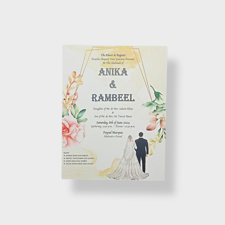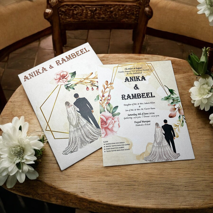 "The Walk of Promise is an artistic 8.5" x 6.5" invitation that elegantly merges contemporary illustration with classic romance. The design features a delicate, custom silhouette of the newlywed couple framed by a striking gold geometric border. This is beautifully complemented by soft washes of watercolor and lush, modern florals, creating a truly unique and heartfelt statement."