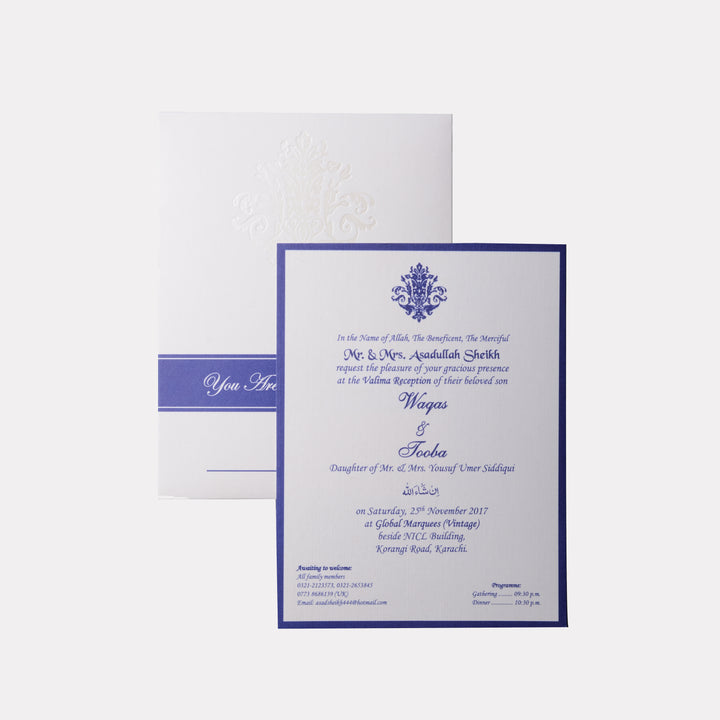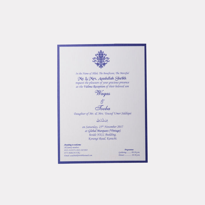 An invitation that echoes timeless sophistication—graced with regal blue tones, elegant flourishes, and a refined layout. Perfectly capturing the essence of a dignified celebration where tradition meets elegance.