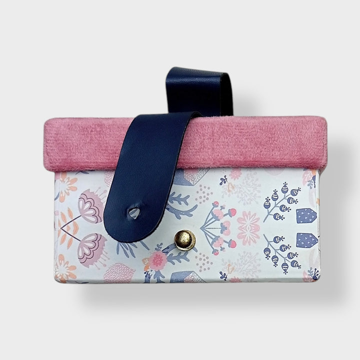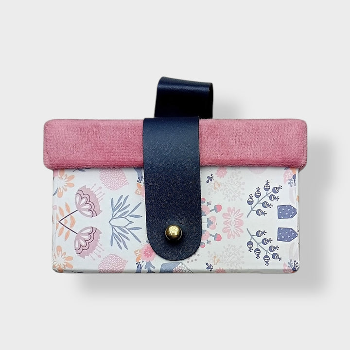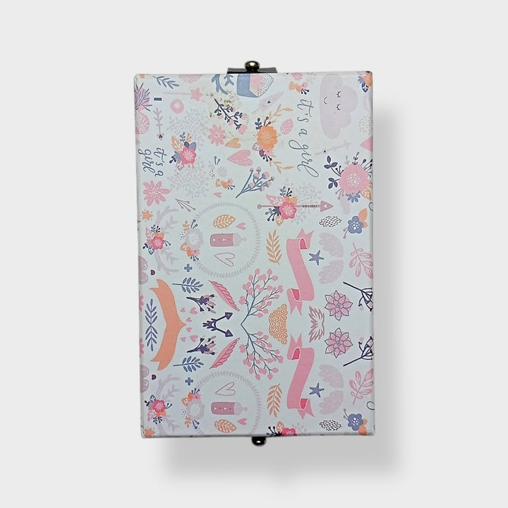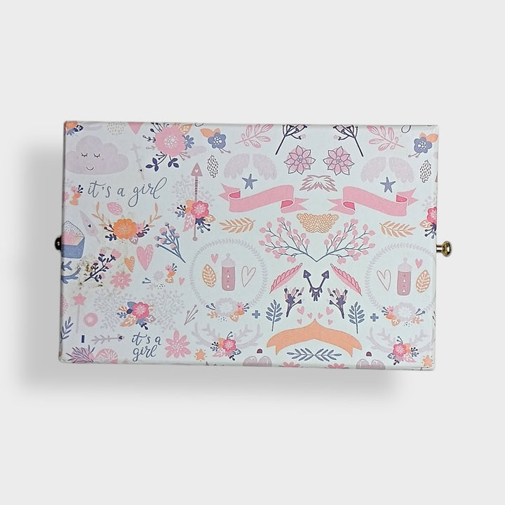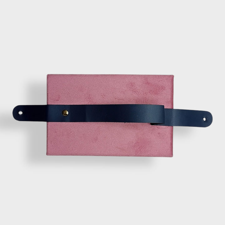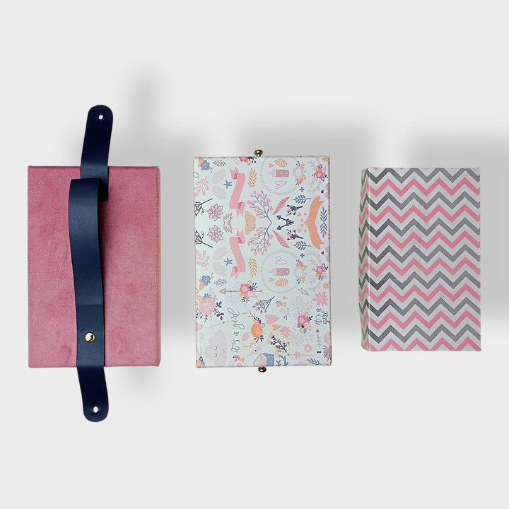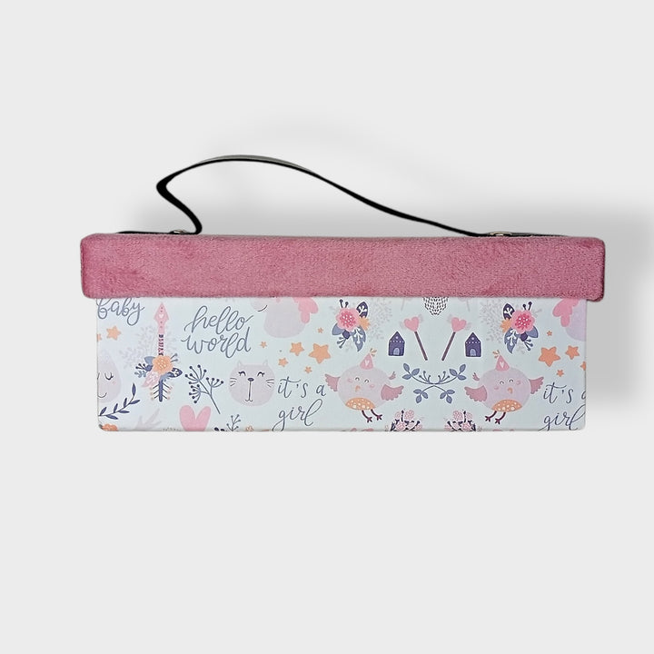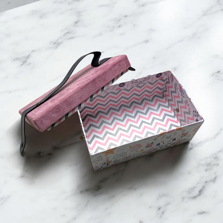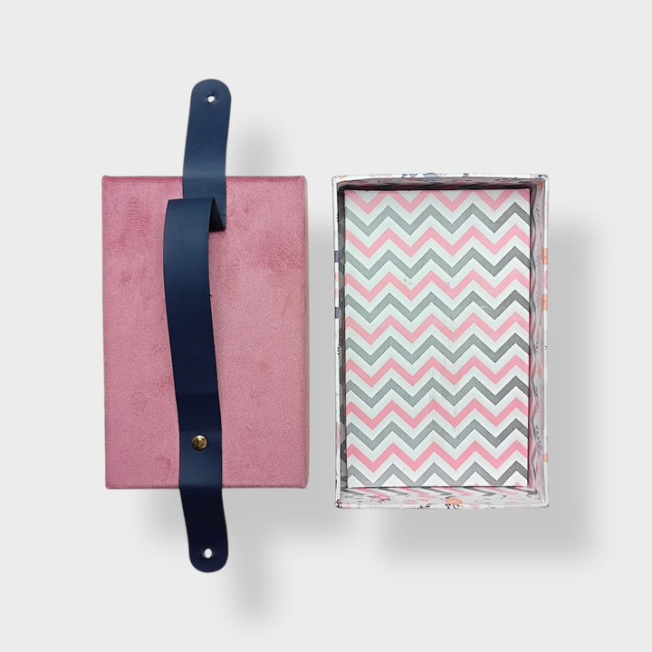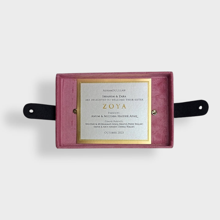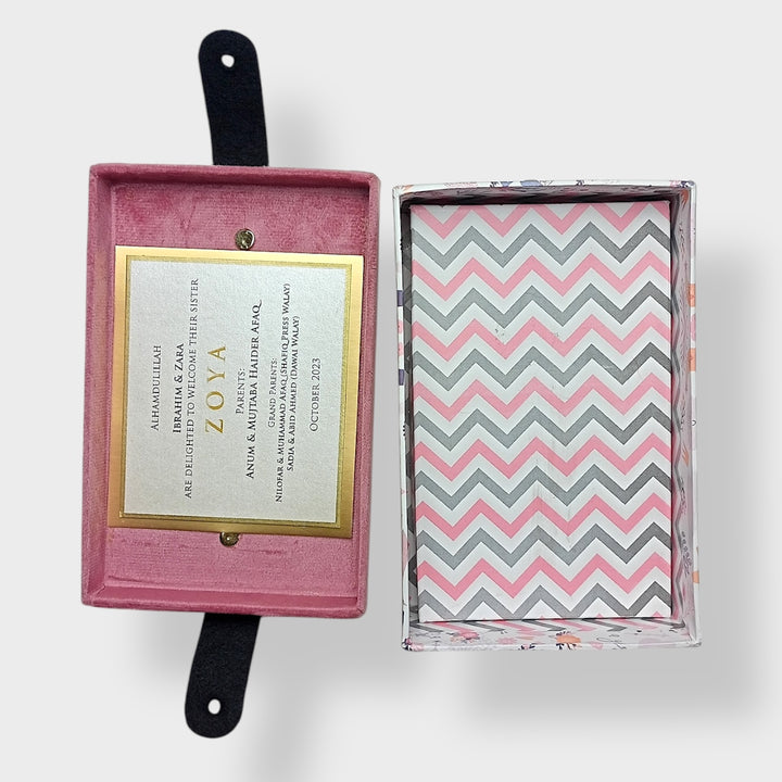 A modern keepsake for a precious announcement. The plush pink velvet lid opens to a playful chevron interior, framing the golden details of Zoya's arrival.